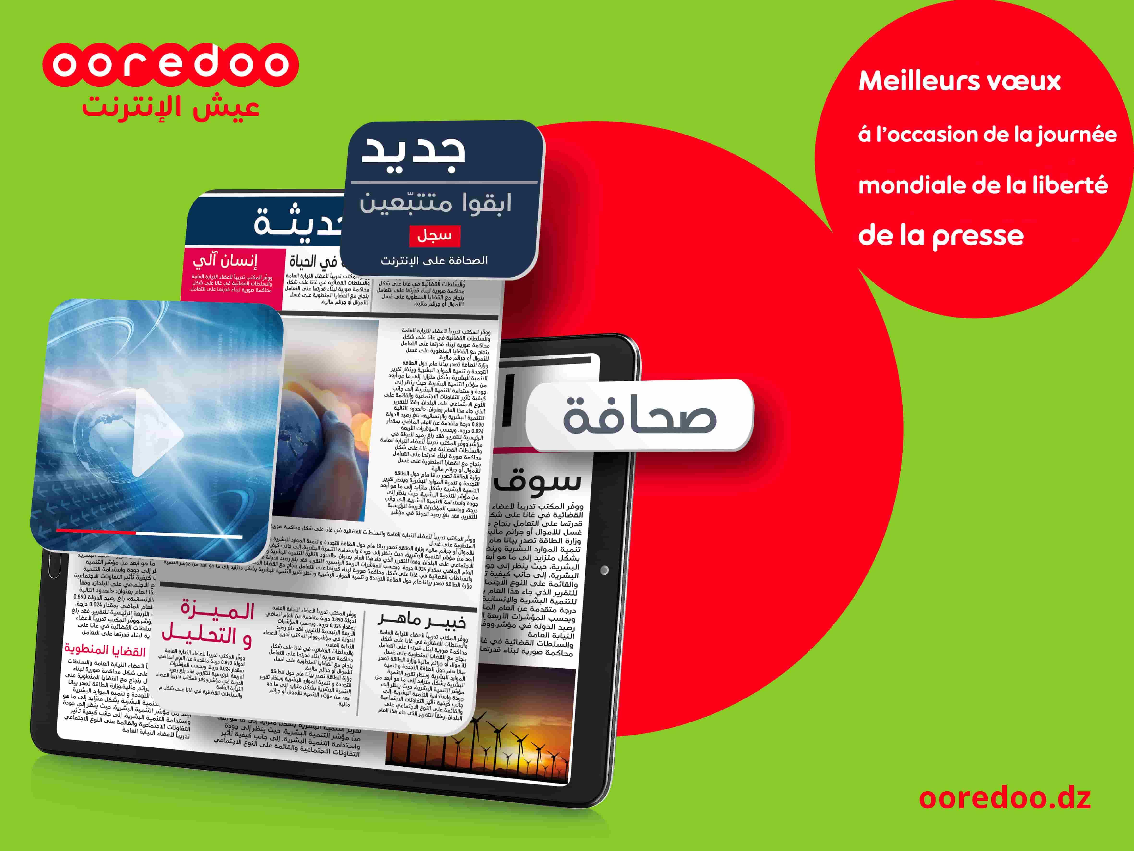 الشريك التقليدي للإعلام الجزائري، تسجل Ooredoo حضورها في اليوم العالمي لحرية الصحافة الذي يُحتفل به عبر العالم في 03 ماي من كل سنة، وتُقدم للأسرة الإعلامية الجزائرية تهانيها الخالصة متمنية لها المزيد من النجاح.