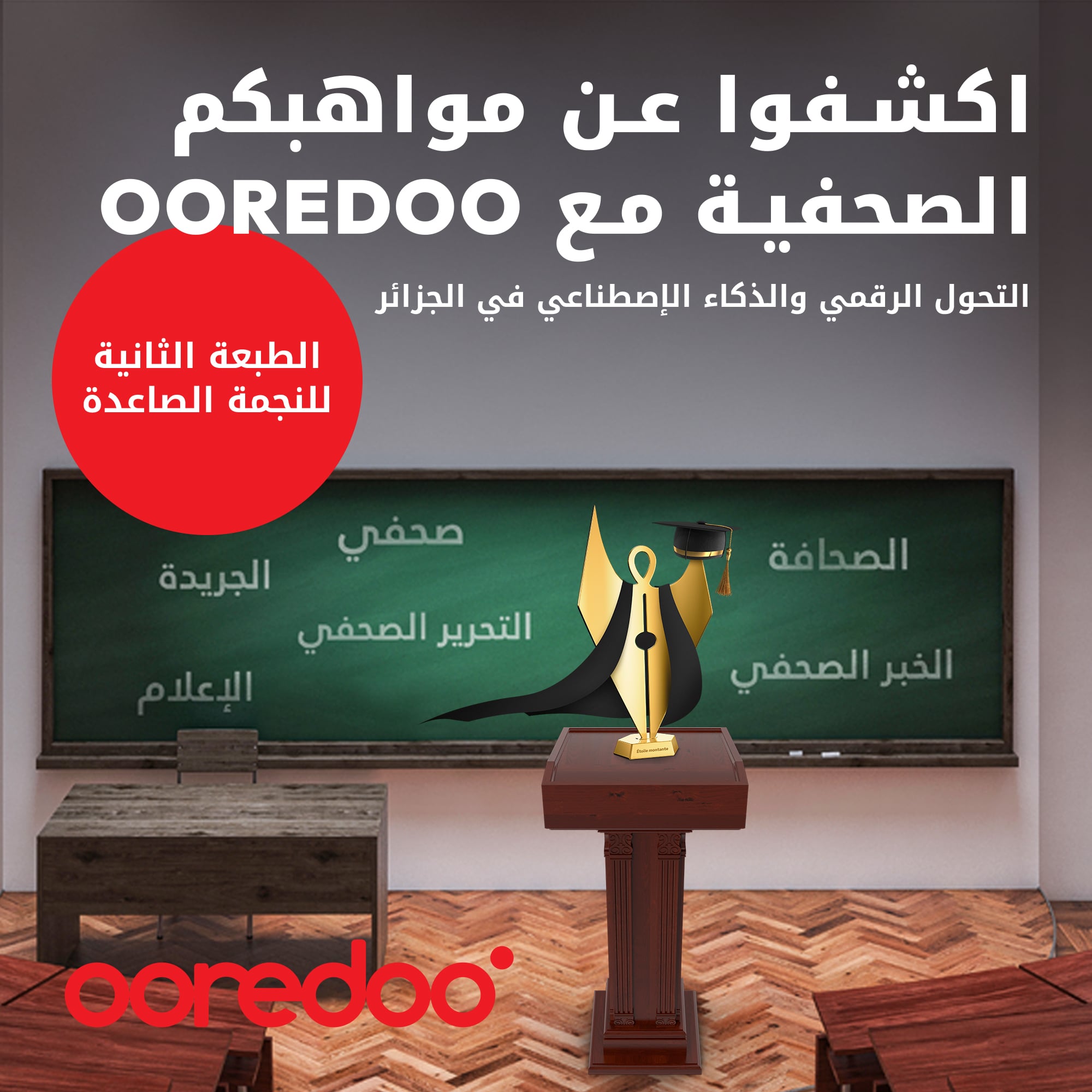 في إطار التزامها المستمر بدعم الابتكار وتطوير المواهب الصحفية في الجزائر، تعلن Ooredoo عن إطلاق الطبعة الثانية من مسابقة "النجمة الصاعدة"، الموجهة لطلبة علوم الإعلام والاتصال والصحافة عبر كامل التراب الوطني.