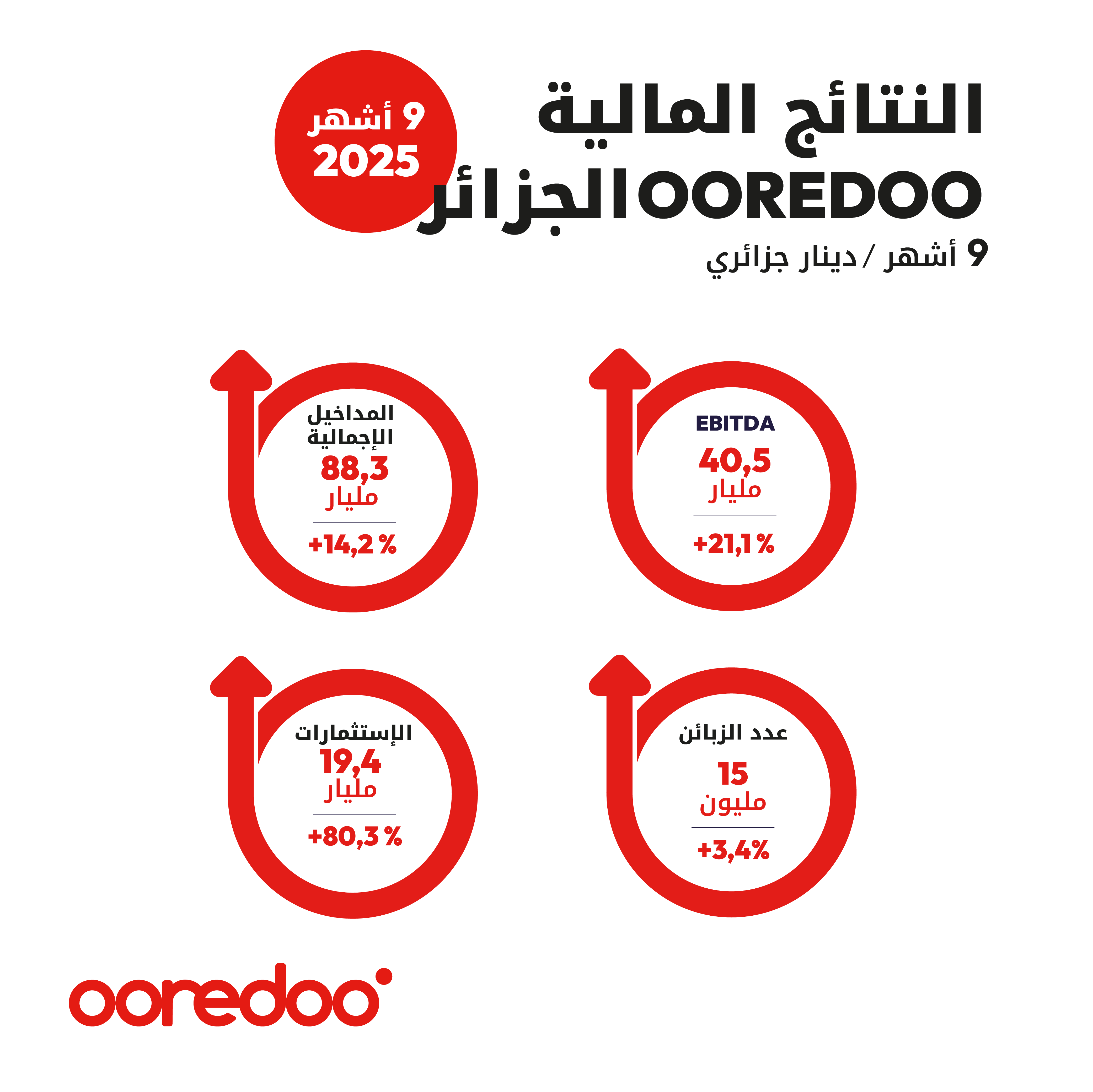 تُظهر النتائج المالية لمؤسسة Ooredoo الجزائر خلال التسعة أشهر الاولى من سنة 2025 إرادة المؤسسة في المساهمة بشكل أكبر في تطوير قطاع الهاتف النقال في الجزائر، من خلال تسريع وتيرة رقمنة خدماتها وحلولها التكنولوجية في السوق وإثراء التجربة الرقمية لزبائنها الذين يمثلون قلب اهتماماتها.