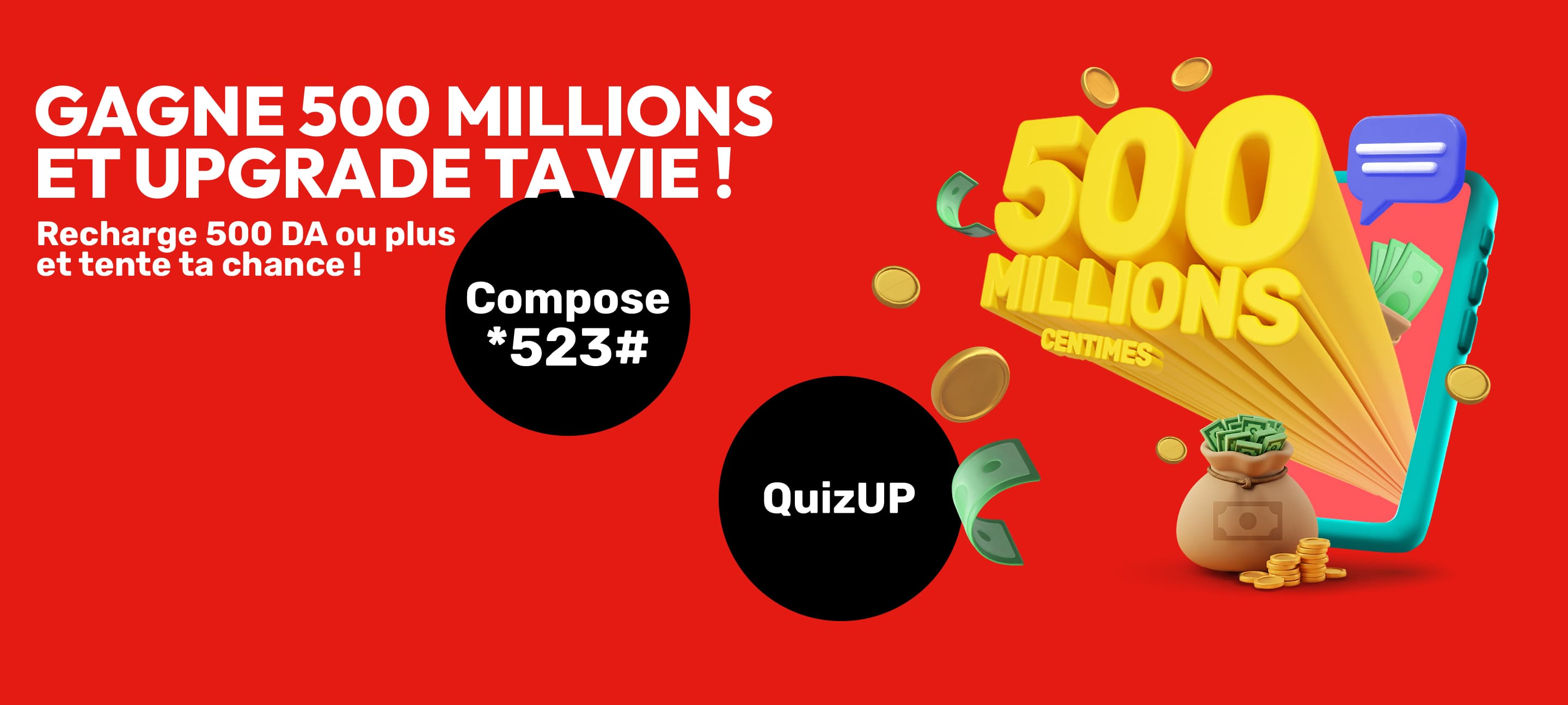 Le client est invité à participer au jeu QuizUp après l’acquisition d’un forfait ou le rechargement de 500 DA ou plus sur tous les canaux, et ce durant 5 mois.