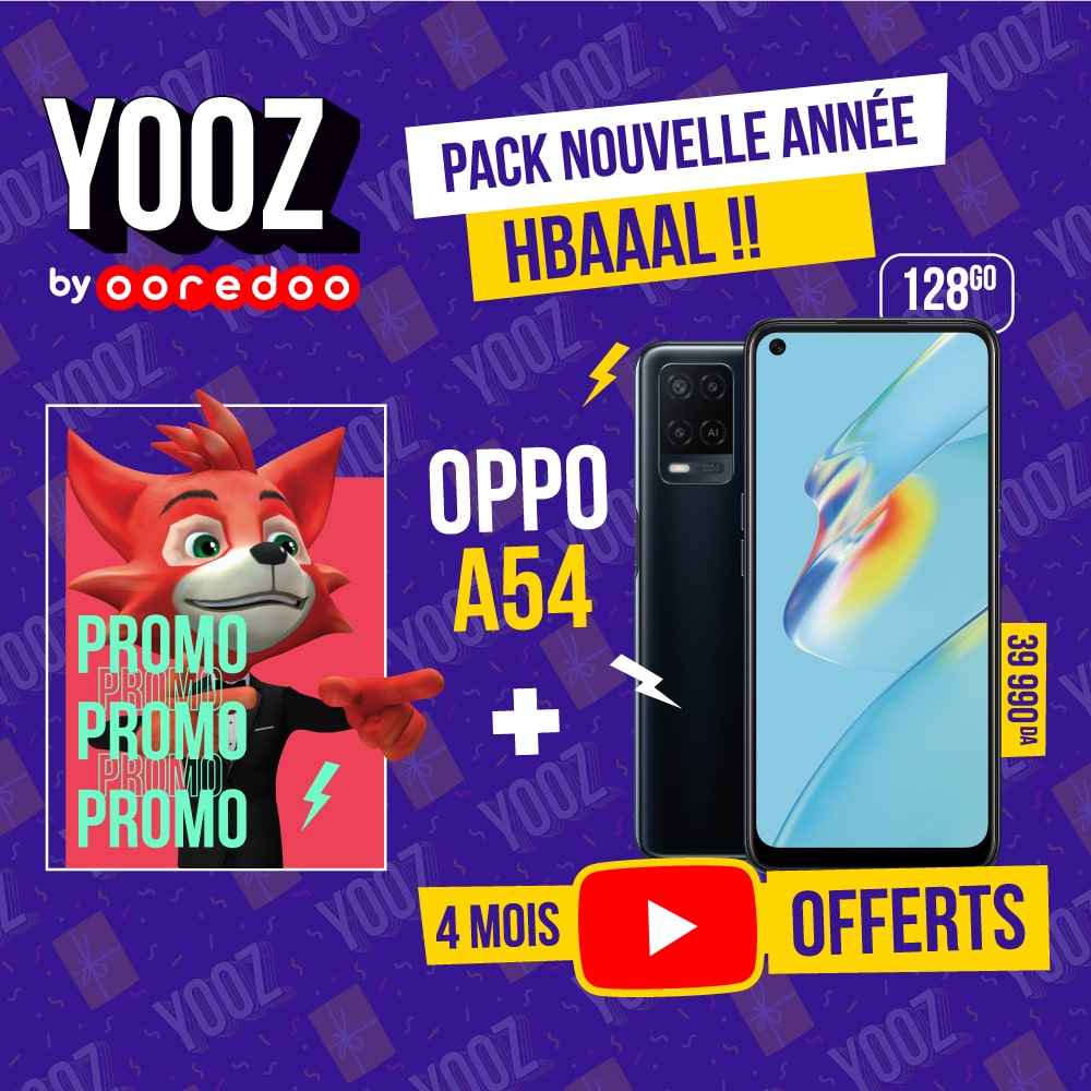 Avec 39 990 DA, le client bénéficie d’un Smartphone OPPO A 54 « 128 Go » et d’une carte SIM Yooz, lui offrant un accès à YouTube pendant 4 mois et l’opportunité de profiter d’un accès illimité au contenu musical riche et diversifié de ANAZIK pendant le premier mois.